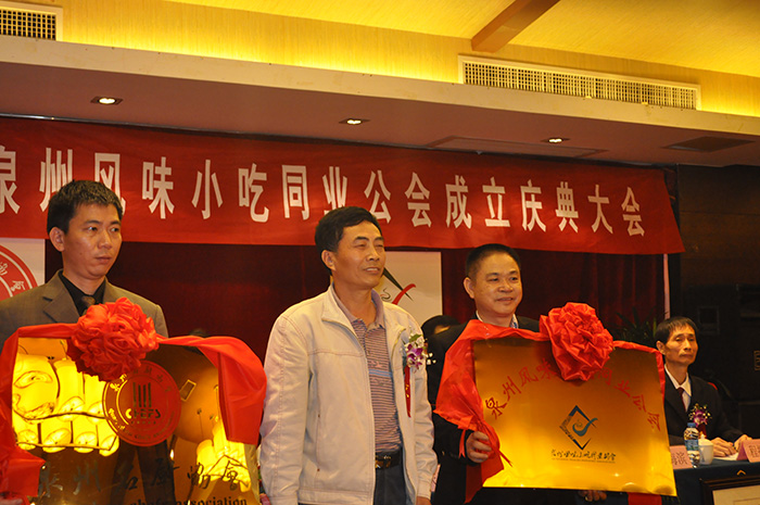 泉州市民政局副局长黄光运先生给泉州名厨协会长许民强先生颁发会牌证书、印章